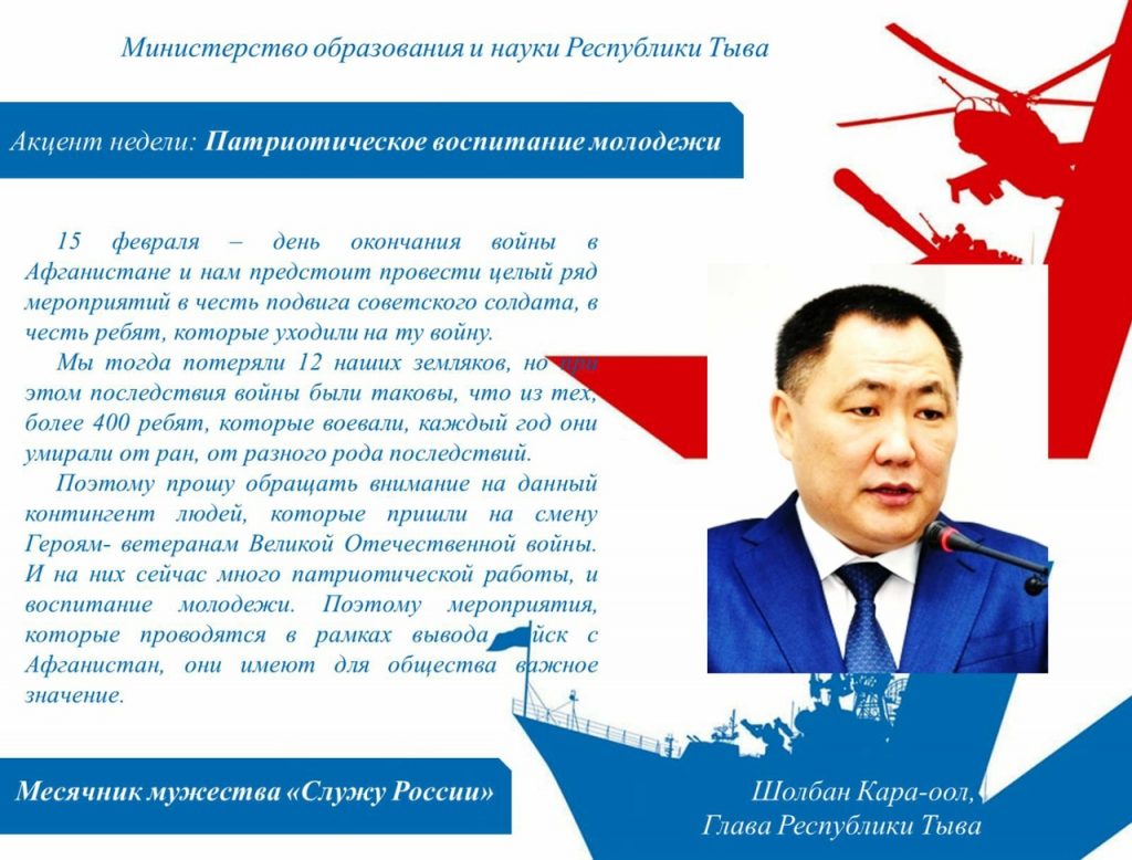 Без рубрики В МБОУ СОШ им.В.Б.Брагина с.Бурен-Бай-Хаак идет месячник мужества «Служу России — 2021» 19.02.2021 / «Стержень нашей деятельности — это, прежде всего, объединять людей, в особенности молодое поколение, через патриотизм, любовь к Родине» Шолбан Валерьевич Кара-оол